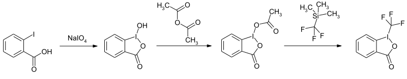 該合成包括三個步驟。在xxx步中,2-碘苯甲酸被高碘酸鈉氧化并環化為1-羥基-1,2-苯并碘酚-3(1H)-酮。然后通過與醋酸酐的酰化反應和隨后與三氟甲基三甲基硅烷的取代反應可以得到目標化合物。
